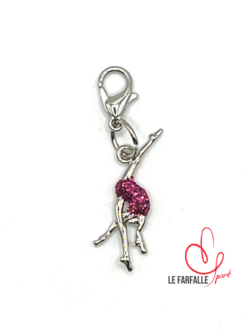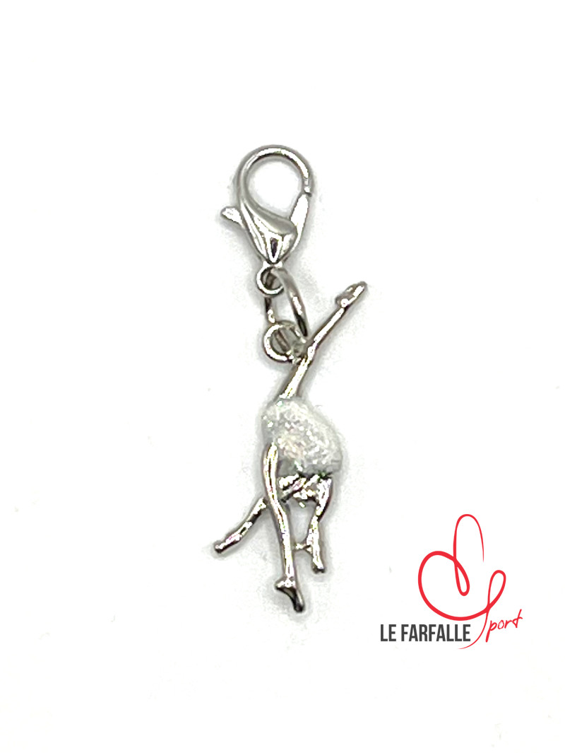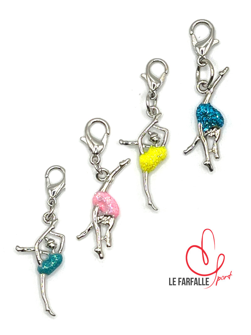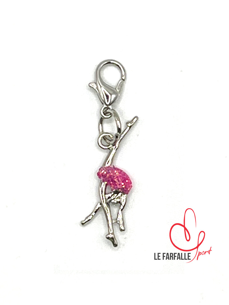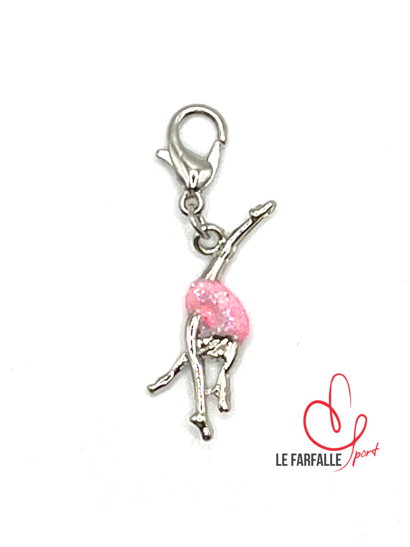 Ciondolo glitterato con moschettone. Raffigurazione di ginnasta in presa dietro o sgambata, pose tipiche della ginnastica ritmica. Un regalo simpatico per la tua piccola atleta, un gadget da regalare al saggio o un simpatico oggetto da allegare al sacchettino dei confetti per la comunione.
