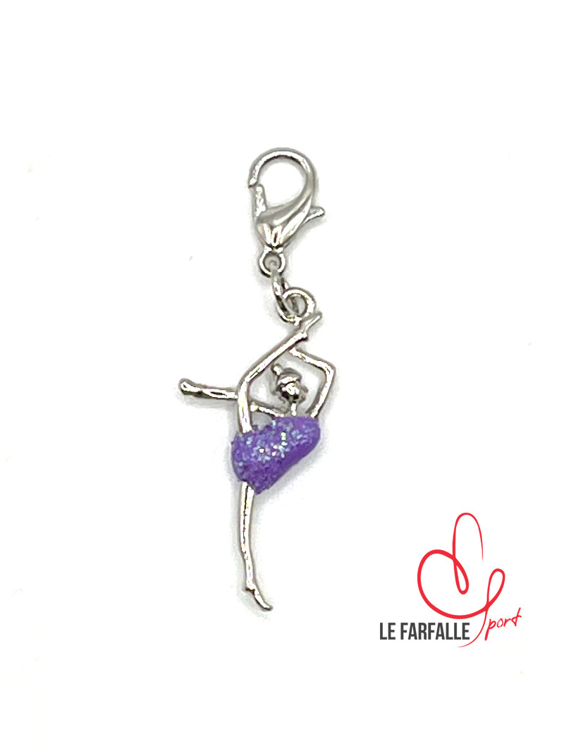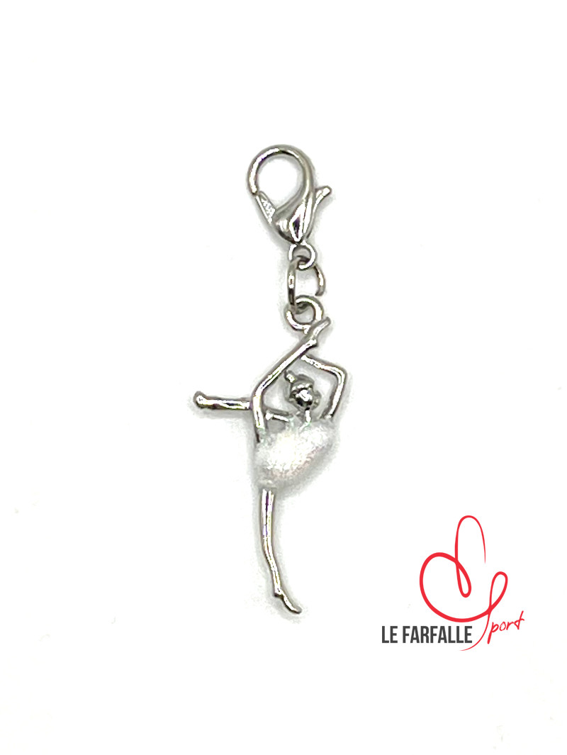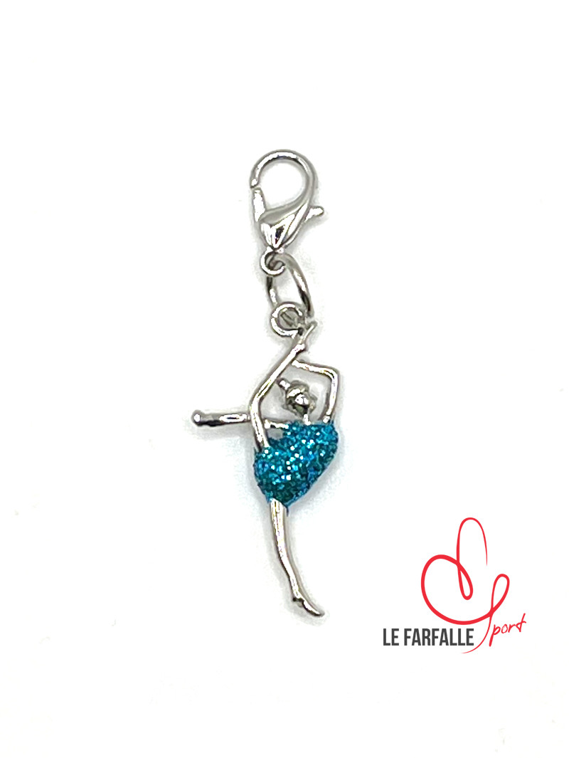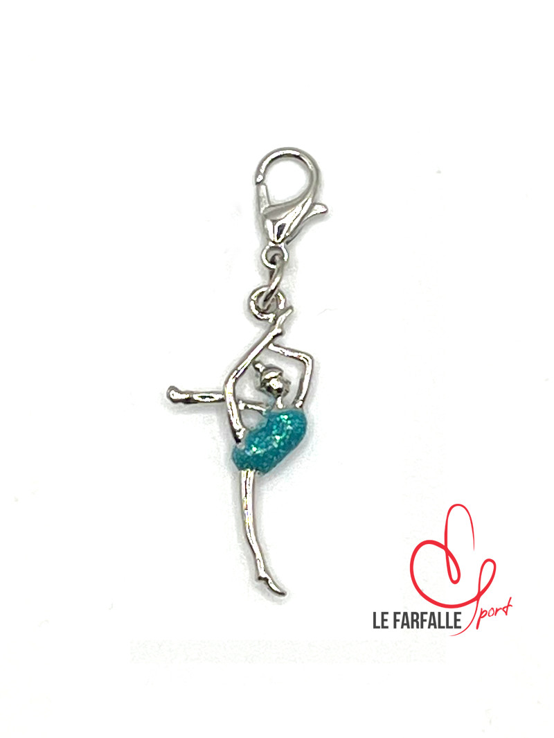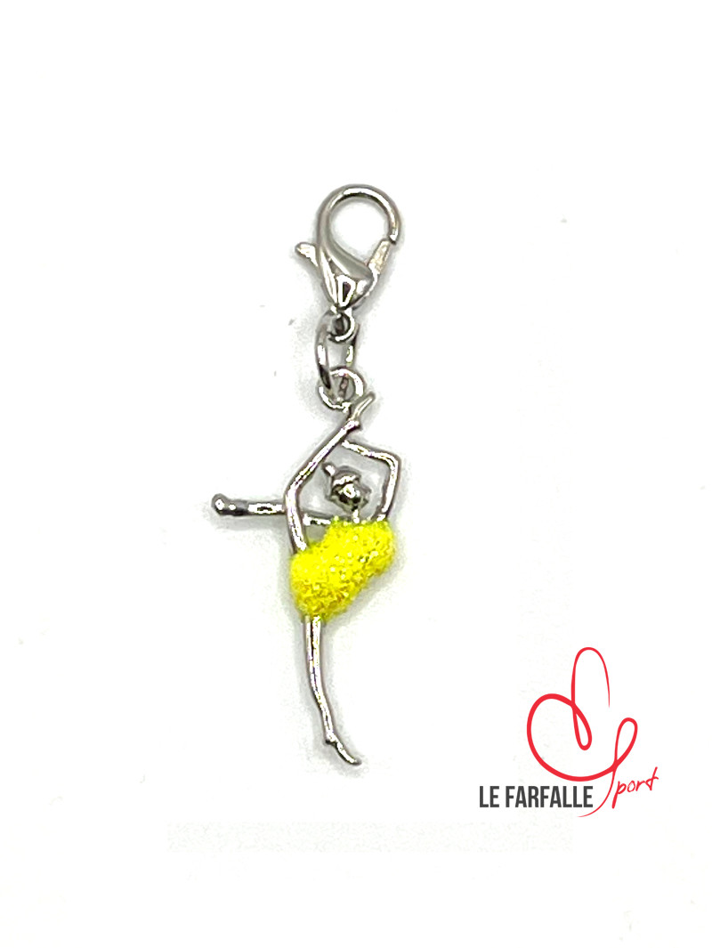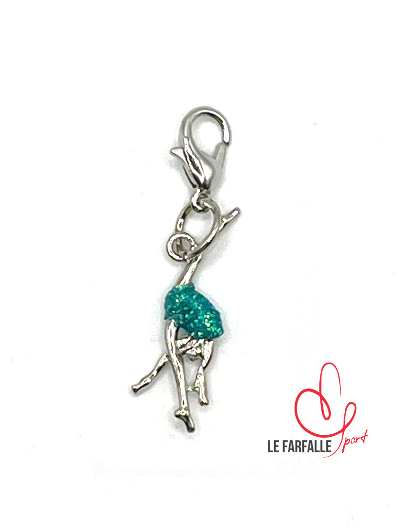 Ciondolo glitterato con moschettone. Raffigurazione di ginnasta in presa dietro o sgambata, pose tipiche della ginnastica ritmica. Un regalo simpatico per la tua piccola atleta, un gadget da regalare al saggio o un simpatico oggetto da allegare al sacchettino dei confetti per la comunione.