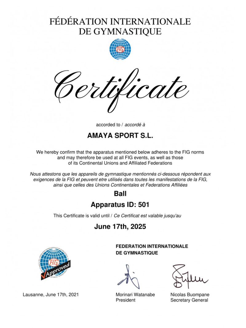 Membro della Federazione Internazionale di Ginnastica Ritmica, con oltre cinquant’anni di esperienza nella continua ricerca e sviluppo di nuovi articoli per lo sport. La qualità delle materie prime europee, insieme all’integrazione degli ultimi sviluppi e progressi tecnologici nei macchinari, fanno la differenza in termini di qualità. I prodotti realizzati da Amaya Sport sono certificati dalla FIG, garantendone la qualità e l’approvazione per la pratica di questo sport.
