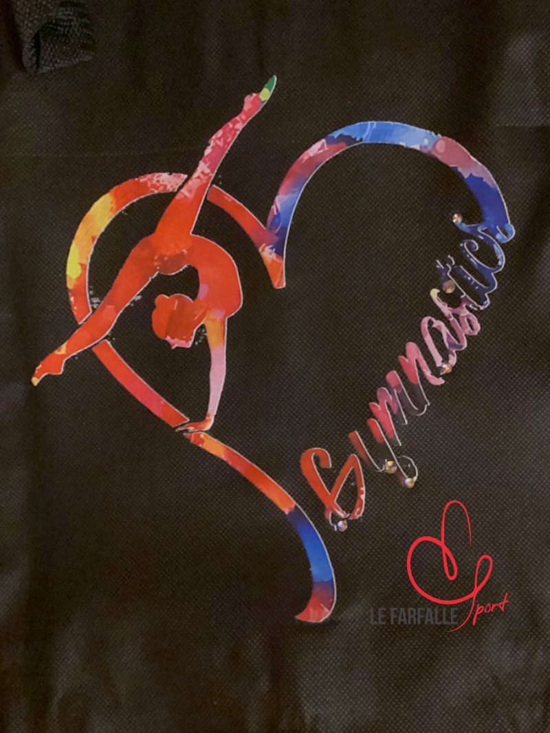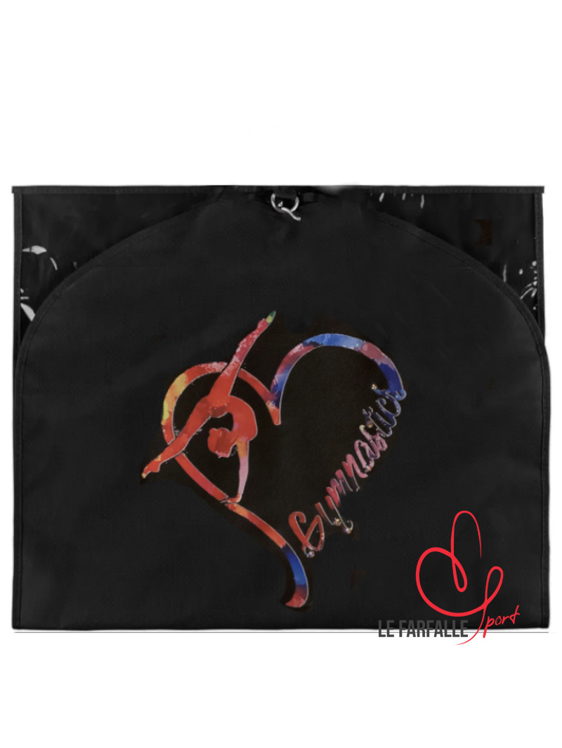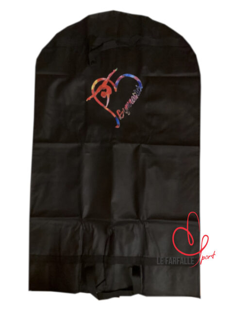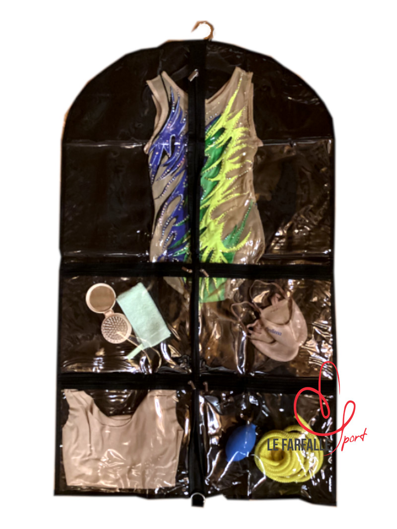 Porta body decorato con illustrazione e strass. All’interno ha tre comode tasche trasparenti con cerniera per contenere accessori e mezzepunte. Le dimensioni lo rendono utile anche al trasporto di body accademici.