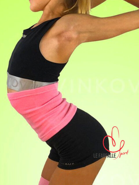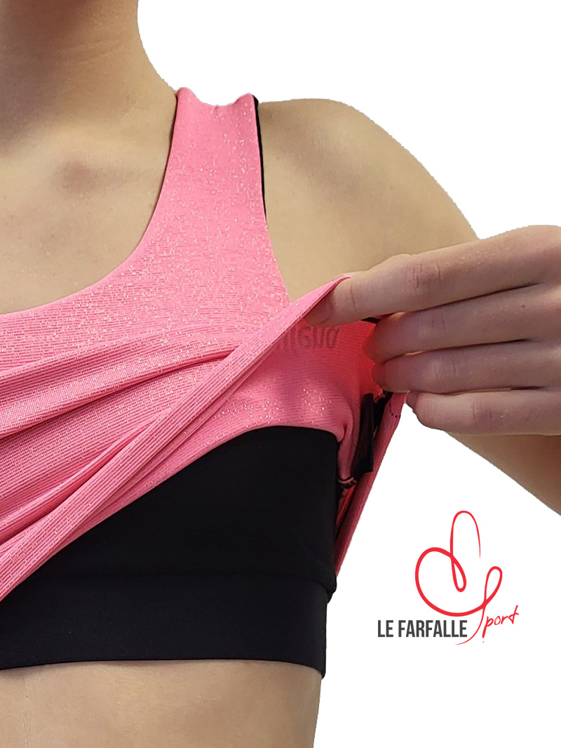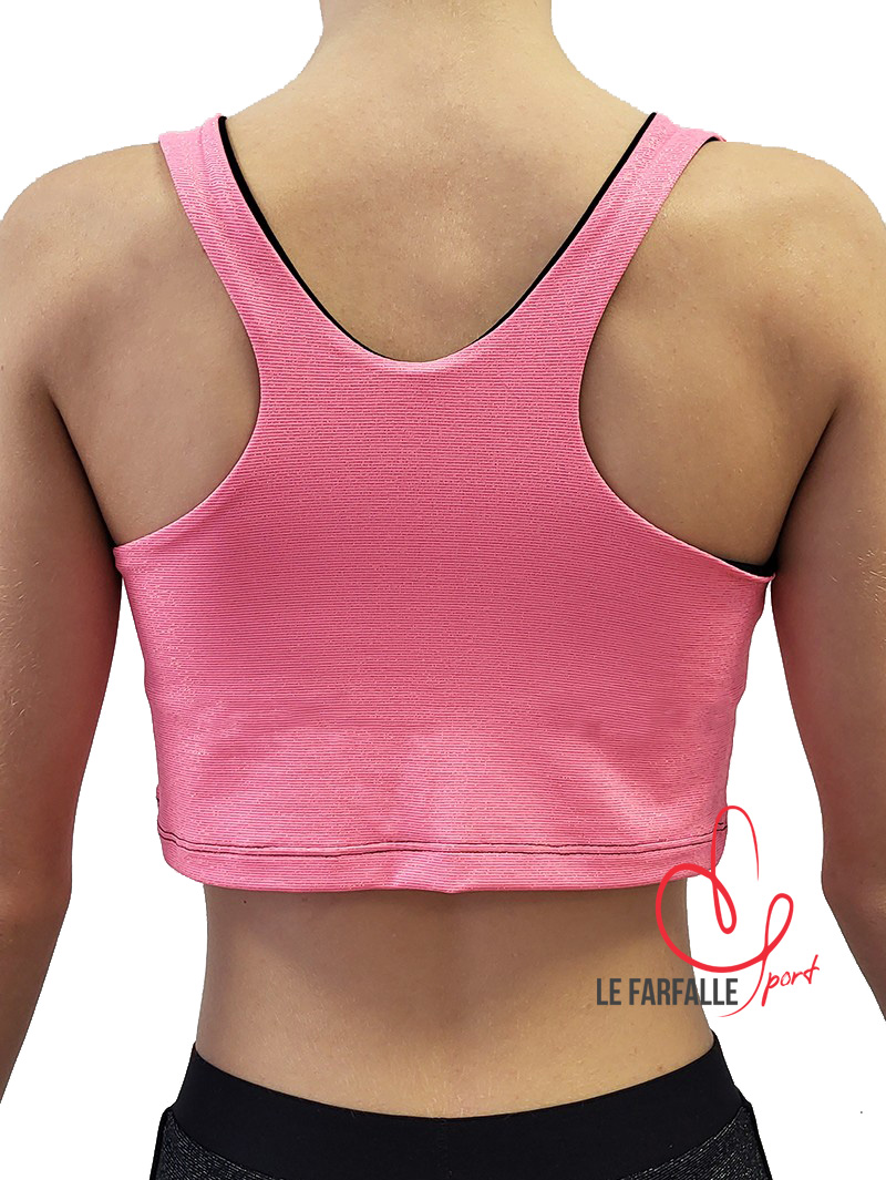 Top cropped con schiena a vogatore e doppio strato. Composto da un top in cotone nero con elastico in vita cucito ad uno strato superiore più lungo e ampio in tessuto lycra rosa con filo argentato. Design confortevole e originale, completamente adattabile al corpo in modo che non si muova durante l’allenamento. Tessuto spagnolo di alta qualità, permette al corpo di respirare